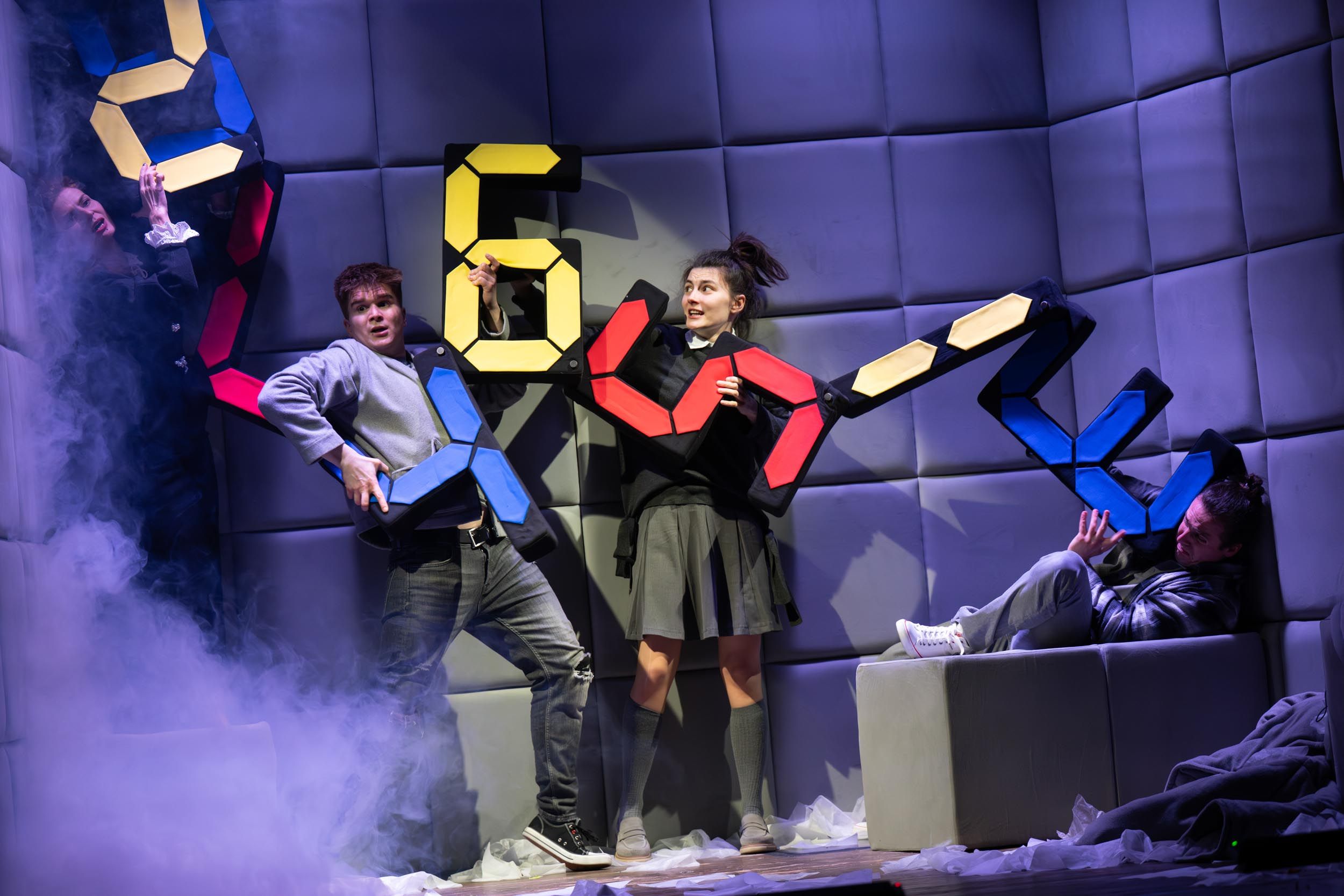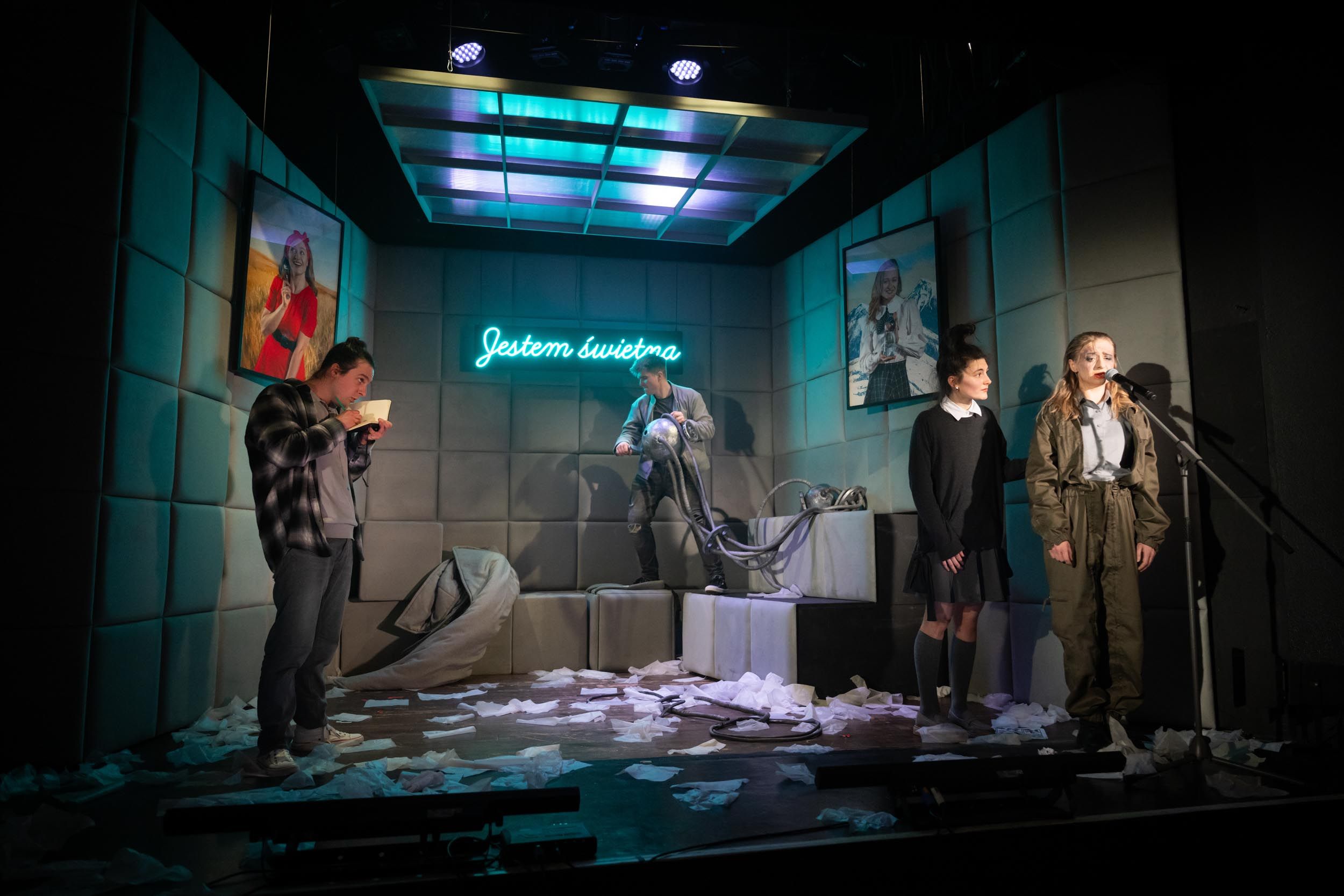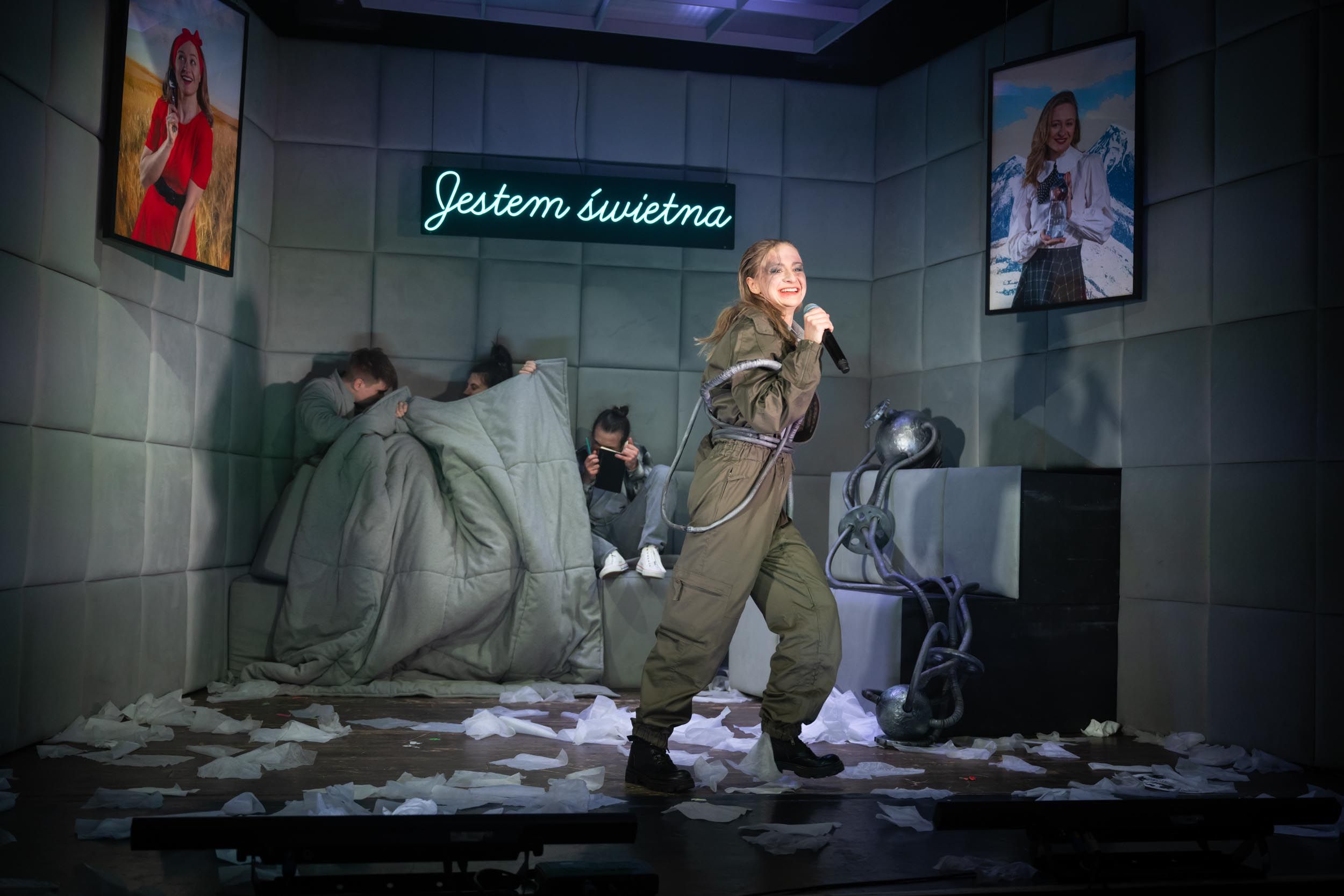 Znakomici aktorzy dodają historii wiarygodności i podtrzymują emocje u widzów. W głównej roli oglądamy debiutującą na katowickiej scenie Aleksandrę Klocek. Jest znakomita i magnetycznie wciąga nas w świat przygody, choć mam też lekki problem ze scenariuszową lub reżyserską wiarygodnością tej postaci, która sama siebie określa jako dziewczynę szarą i przeciętną, zaś w nowym środowisku staje się duszą towarzystwa, znakomicie odnajdującą się w relacjach z kolejnymi bohaterami. Świetny w swoim kompulsywnym rysowaniu był Michał Skiba, znakomicie od obojętności, przez zaangażowanie, aż do wybuchu emocji poprowadził swojego bohatera Dawid Kobiela. W spektaklu wystąpiła także autorka scenariusza Urszula Gołdowska oraz Katarzyna Prudło, Ewa Reymann i Aleksandra Zawalska. Ta ostatnia jako paczka chusteczek wprowadzała dużo humoru (pozostaję też fanem skierowanego do dorosłych żartu wygłoszonego przez Dawida Kobielę, że chusteczki mogą być wykorzystywane do różnych celów, po którym jego autor zniknął pod kołdrą).