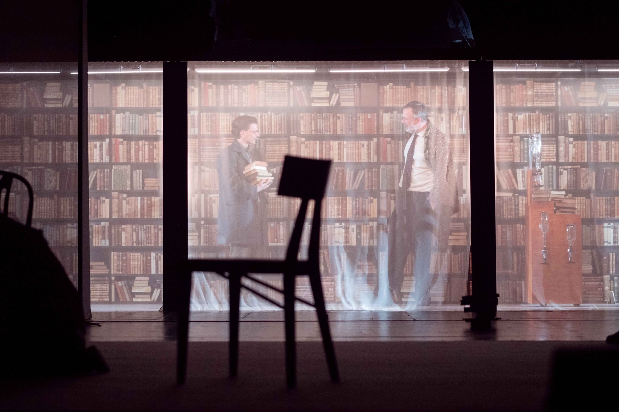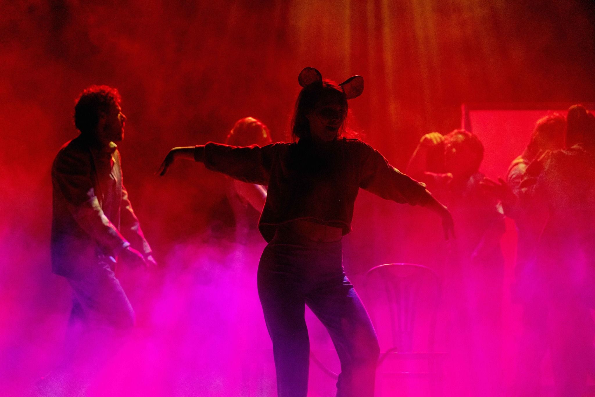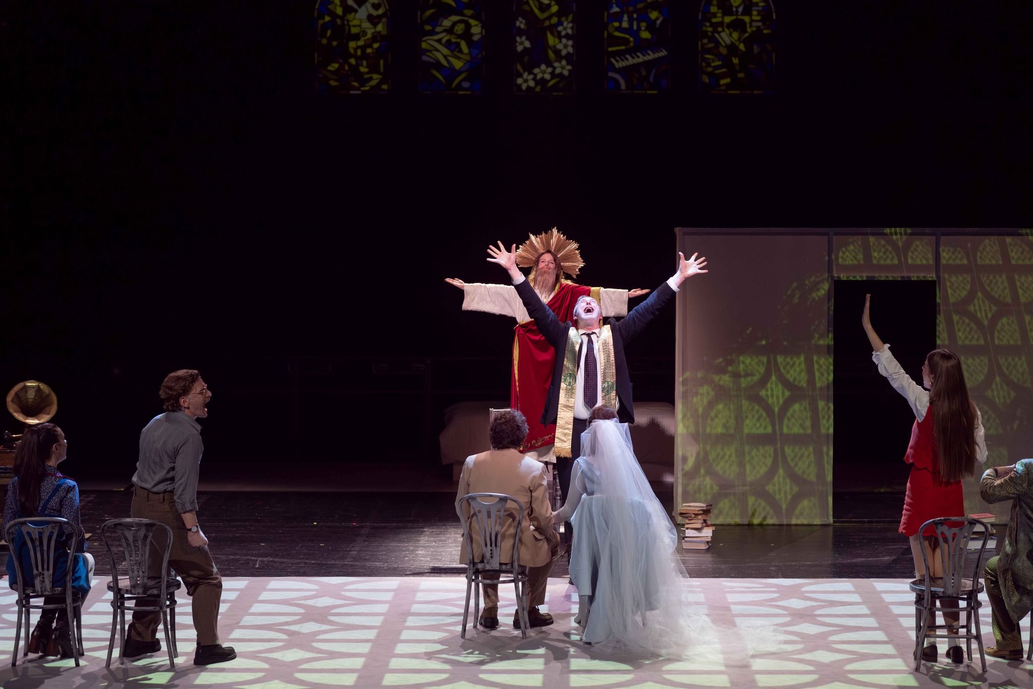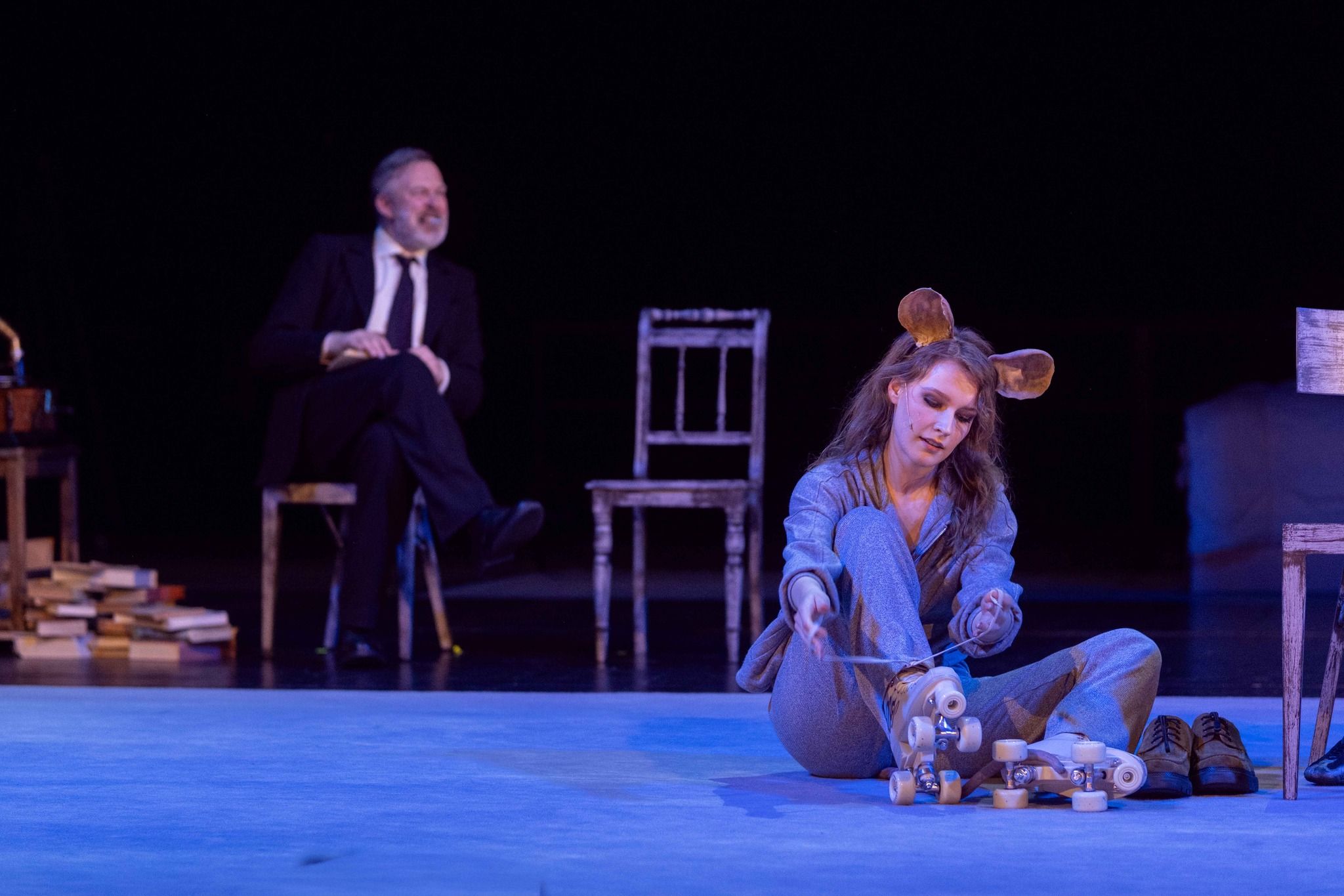 Grający w głównej roli Miron Jagniewski jest dokładnie taki, jaki być powinien bohater tego spektaklu - z jednej strony ciągle odrobinę zdziwiony, z drugiej - przyjmujący za pewnik nienormalność otaczającego go świata. Delikatność jego gry, lekkie jedynie przeciągnięcie, robi wrażenie i mocno zapadło mi w pamięć. W rolę jego przyjaciela wciela się Jakub Klimaszewski i choć to właśnie jego wątek jak sądzę można by bez straty dla fabuły okroić, to ze swojej roli wywiązał się znakomicie. W roli Mikołaja widzimy Rafała Kronenbergera, a autora (ale też księdza, antykwariusza, a w finale nawet... kota) gra naprawdę brawurowo Bartosz Woźny. Widać w nim sprawczość autora, poddającego swoich bohaterów próbom, Nie gorzej niż panowie wypadają panie - Karolina Kuklińska, Magdalena Maścianica, Monika Stanek i Aurora Lipartowska (ta ostatnia w roli myszy i kilku innych zadziwiających, religijnych odsłonach).