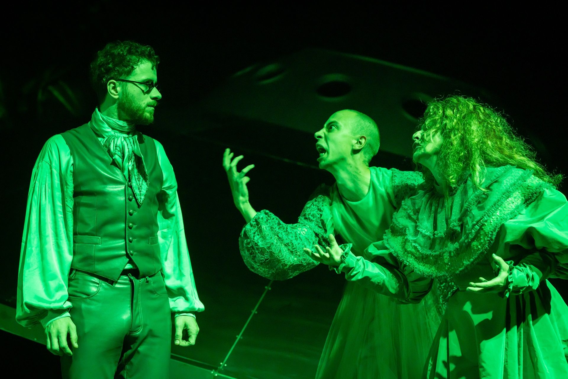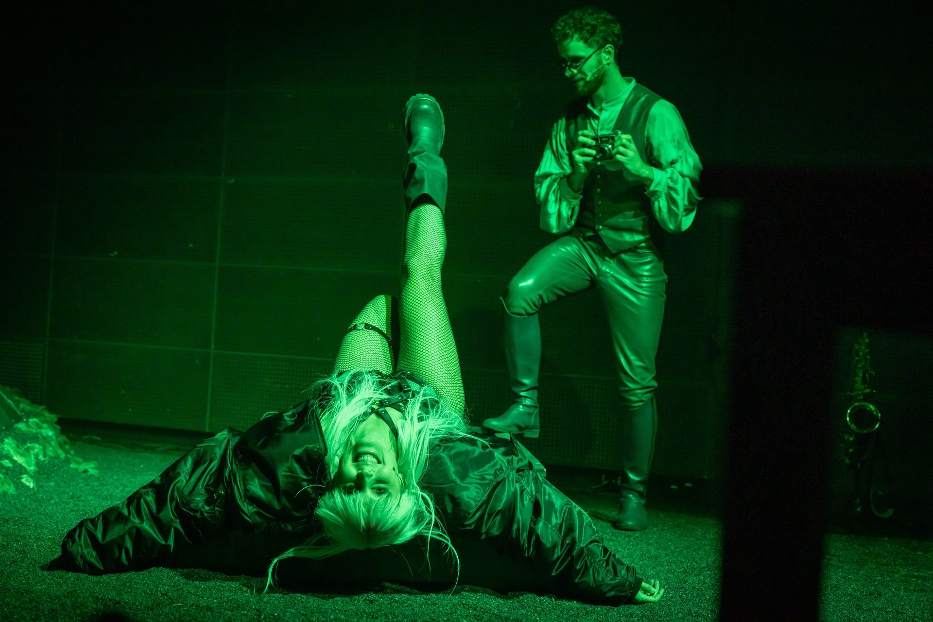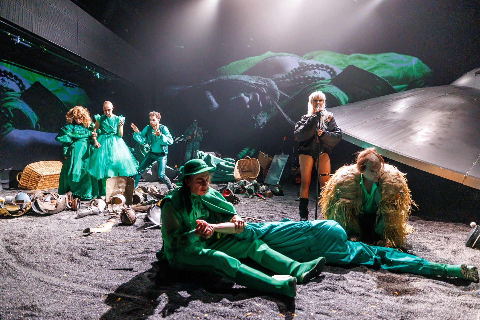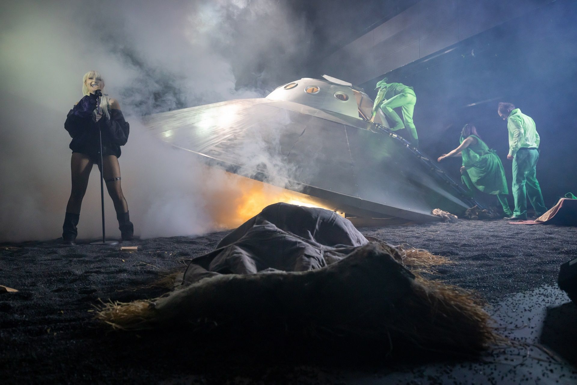 Warto docenić autorki choreografii, czyli duet Hashimotowiksa (Paulina Jaksim i Katarzyna Kulmińską), świetnie wyglądają kostiumy i scenografia Mirka Kaczmarka (choć ogromny statek nie jest dostatecznie wykorzystany. Ale może i dobrze, bo dzięki temu widzimy, że Polacy sami sobie wystarczą i żadni kosmici nie są w stanie odwrócić uwagi od nas samych - od naszych autozachwytów i autonienawiści). Wokalnymi, tanecznymi i aktorskimi umiejętnościami zachwycają aktorzy. Urzekła mnie absolutnie postać Gustava, którego z oddaniem świetnie kreował Daniel Malchar (przy okazji mogący pokazać także swoje instrumentalne zdolności). Jeśli Rafaello wyraża więcej, niż tysiąc słów (pamiętacie - mam nadzieję - tę reklamę), to twarz i postawa Wojciecha Dolatowskiego wyrażają więcej niż tysiąc Rafaello. I jeśli notorycznie czepiam się tutaj wszelkiej maści "chłopów przebranych za baby" w polskich teatrach, to tutaj, jakby na przekór wszystkiemu, wychodzi to znakomicie - jest komiczne, ale ma sens, jest puszczeniem oka, a nie durnym dośmieszaczem. Dolatowski jest po prostu świetny we wszystkim co mówi i co śpiewa, ale - co trudniejsze - też w każdej swojej reakcji granej całym sobą. Oddzielne brawa za scenę z gumą do żucia! Wokalnym powerem zachwyca Karolina Kazoń, mająca najwięcej partii wokalnych. Świetni są Antoni Milancej (Wolf), Magdalena Osińska (zjawa Zośki ze świetnym monologiem między widzami), Marta Waldera (matka i redaktor), Rafał Dziwisz (zjawa z goralenvolk oraz medialny imperator) oraz Dominik Stroka (występujący w opisach jako "Narąbany ideałami Dziennikarz prosto z Wesela").