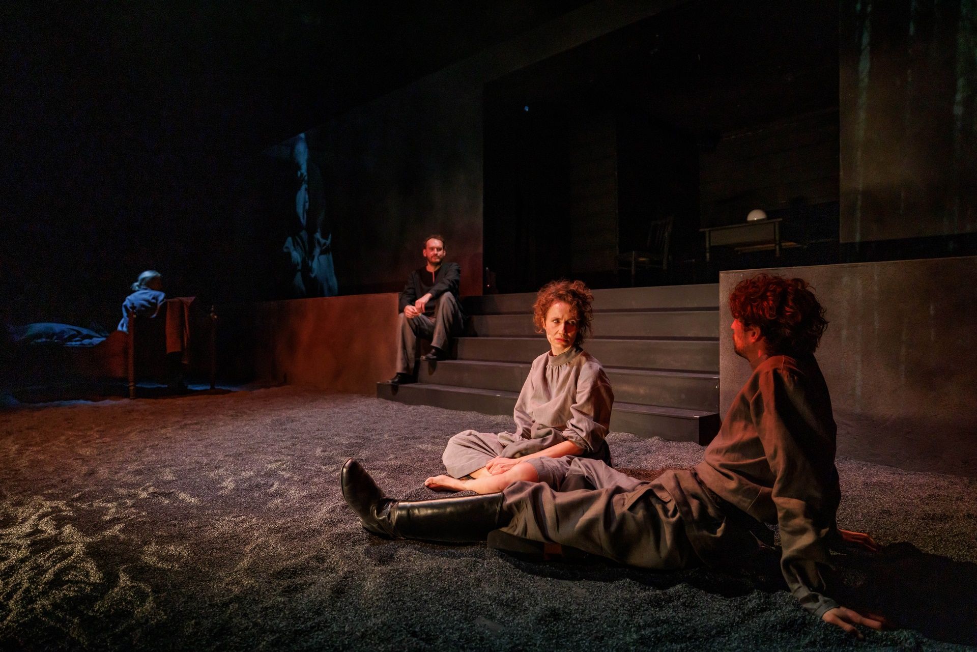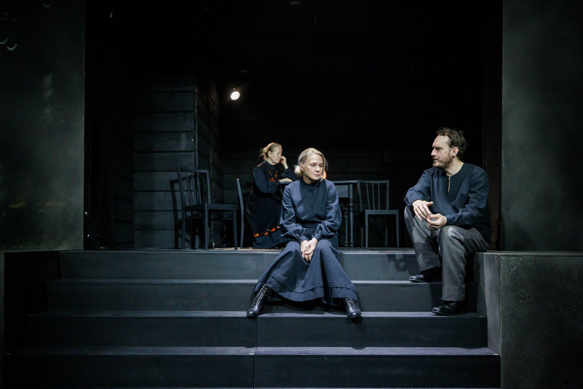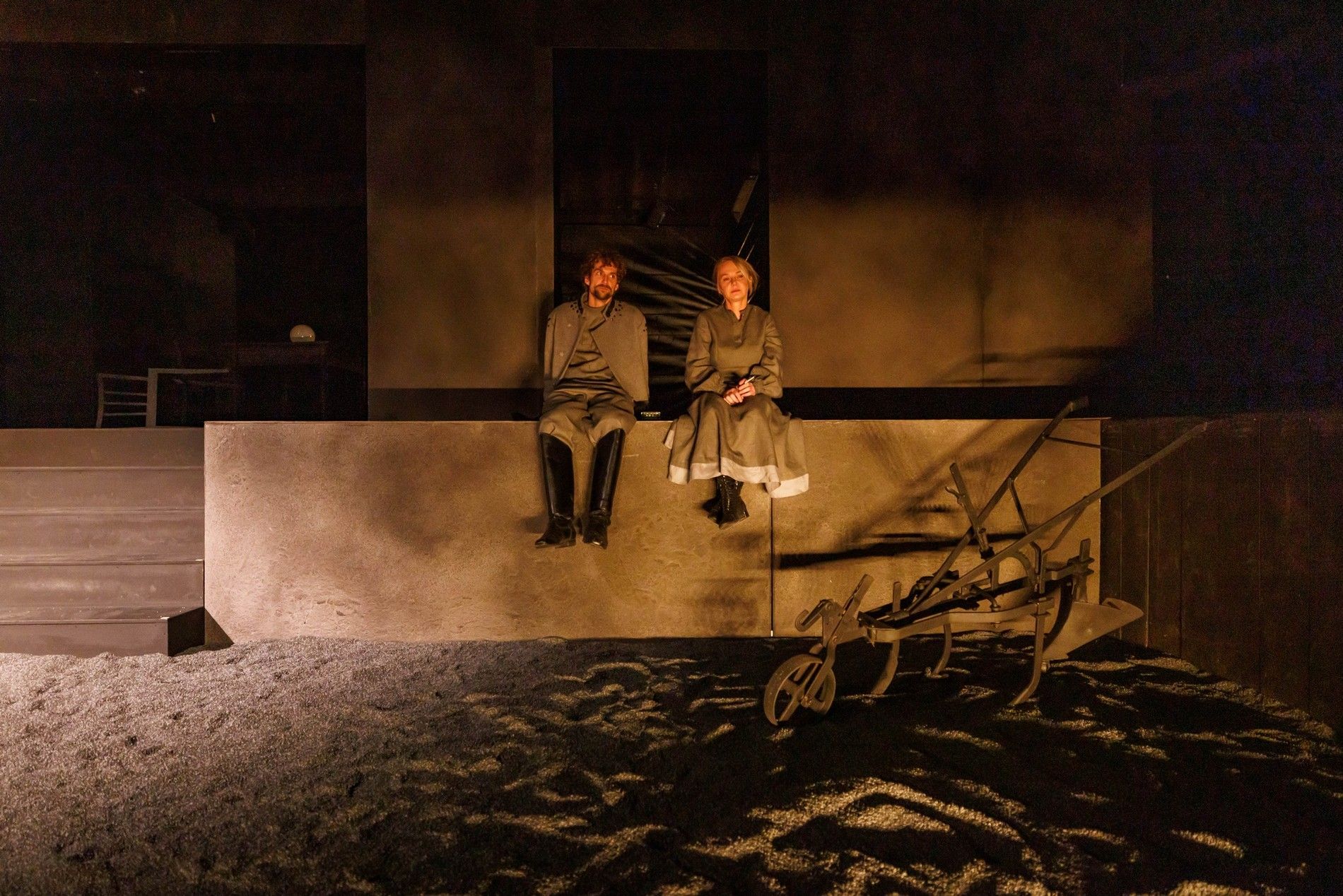 Na scenie w Domu Machin, gdzie grany jest spektakl, niewiele mamy elementów scenografii - ot gumowy granulat niczym ziemia wypełniająca scenę, łóżko, stół, krzesła i pług, ale dokładając do niej projekcje wideo (Piotr Bontron) i piękne kostiumy wzorowane na ludowych, wschodnich haftach (scenografia i kostiumy: Jerzy Basiura) dostajemy widowisko wizualnie wysmakowane i dopieszczone. Przepięknie zagrały światła i półcienie (dzieło Moniki Stolarskiej), a całości dopełniła muzyka Władysława Szabana i choreografia Magdaleny Kaweckiej). W tej przestrzeni rozgrywa się opowieść o właściwej młodym chęci ucieczki do miasta, o miłości i folklorze, który domaga się opisania, wreszcie o wierze i pytaniach o obecność Boga i źródło cierpienia, a przede wszystkim o wsi, która za chwilę zniknie pod wodą wielkiego zbiornika (to stało się z rodzinnym, położonym na Białorusi miastem autorki). A może już znikła? Czas jest w tej historii umowny, a konkret im bardziej na niego patrzymy, tym bardziej rozmywa się, przestaje być ostry, wreszcie rozwiewa się zupełnie.