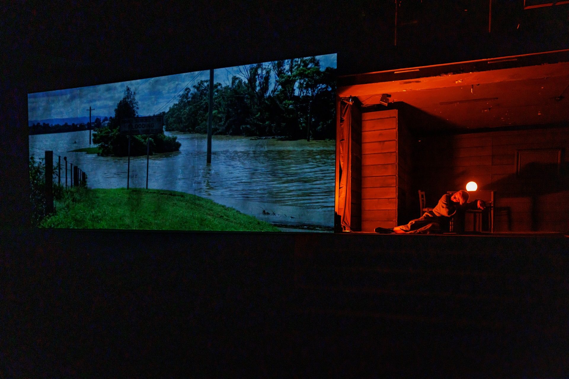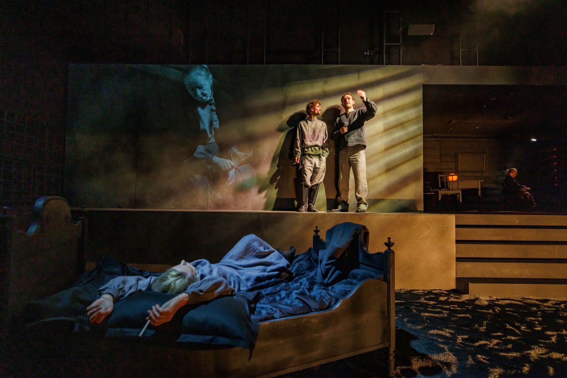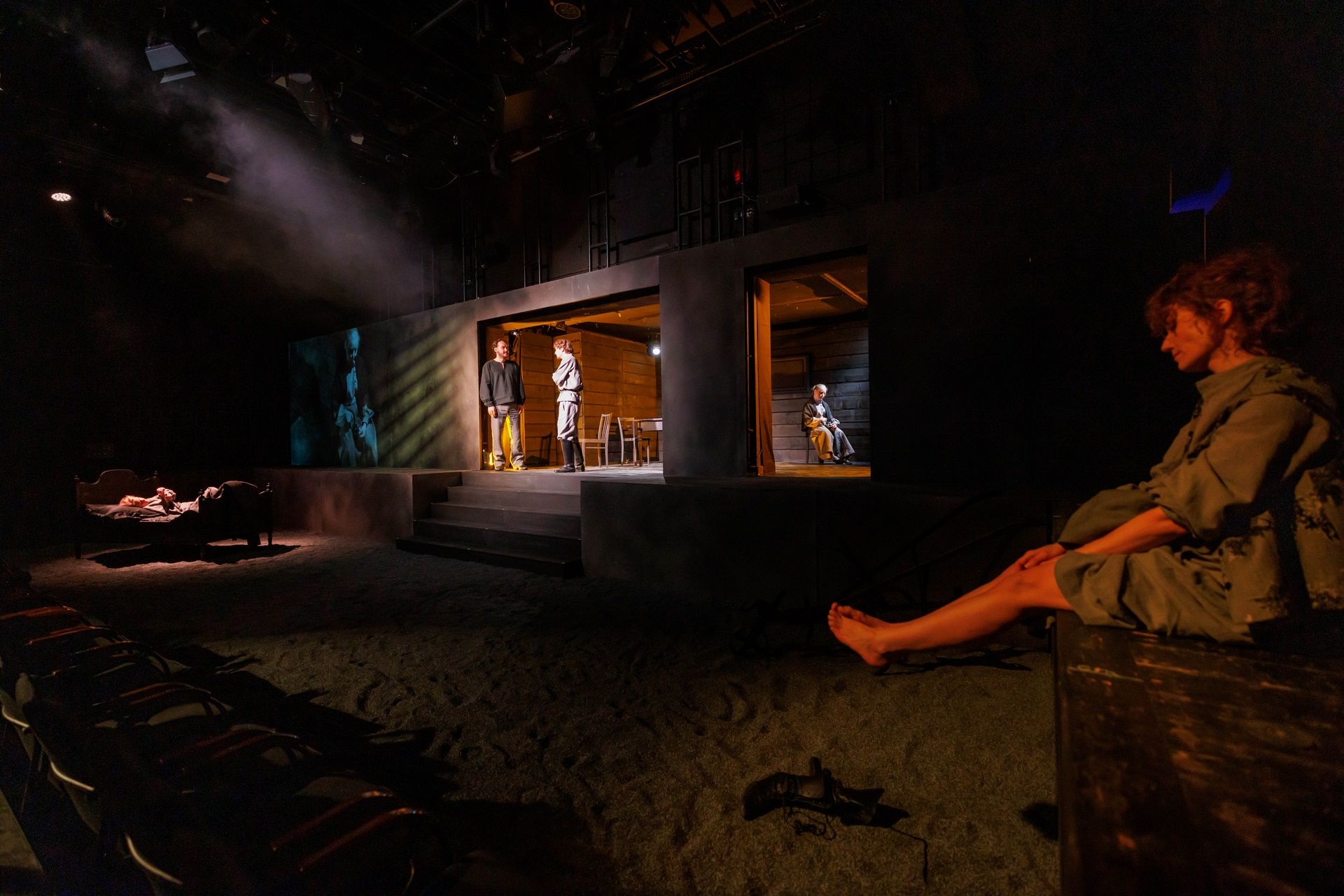 Na scenie w Domu Machin, gdzie grany jest spektakl, niewiele mamy elementów scenografii - ot gumowy granulat niczym ziemia wypełniająca scenę, łóżko, stół, krzesła i pług, ale dokładając do niej projekcje wideo (Piotr Bontron) i piękne kostiumy wzorowane na ludowych, wschodnich haftach (scenografia i kostiumy: Jerzy Basiura) dostajemy widowisko wizualnie wysmakowane i dopieszczone. Przepięknie zagrały światła i półcienie (dzieło Moniki Stolarskiej), a całości dopełniła muzyka Władysława Szabana i choreografia Magdaleny Kaweckiej). W tej przestrzeni rozgrywa się opowieść o właściwej młodym chęci ucieczki do miasta, o miłości i folklorze, który domaga się opisania, wreszcie o wierze i pytaniach o obecność Boga i źródło cierpienia, a przede wszystkim o wsi, która za chwilę zniknie pod wodą wielkiego zbiornika (to stało się z rodzinnym, położonym na Białorusi miastem autorki). A może już znikła? Czas jest w tej historii umowny, a konkret im bardziej na niego patrzymy, tym bardziej rozmywa się, przestaje być ostry, wreszcie rozwiewa się zupełnie.