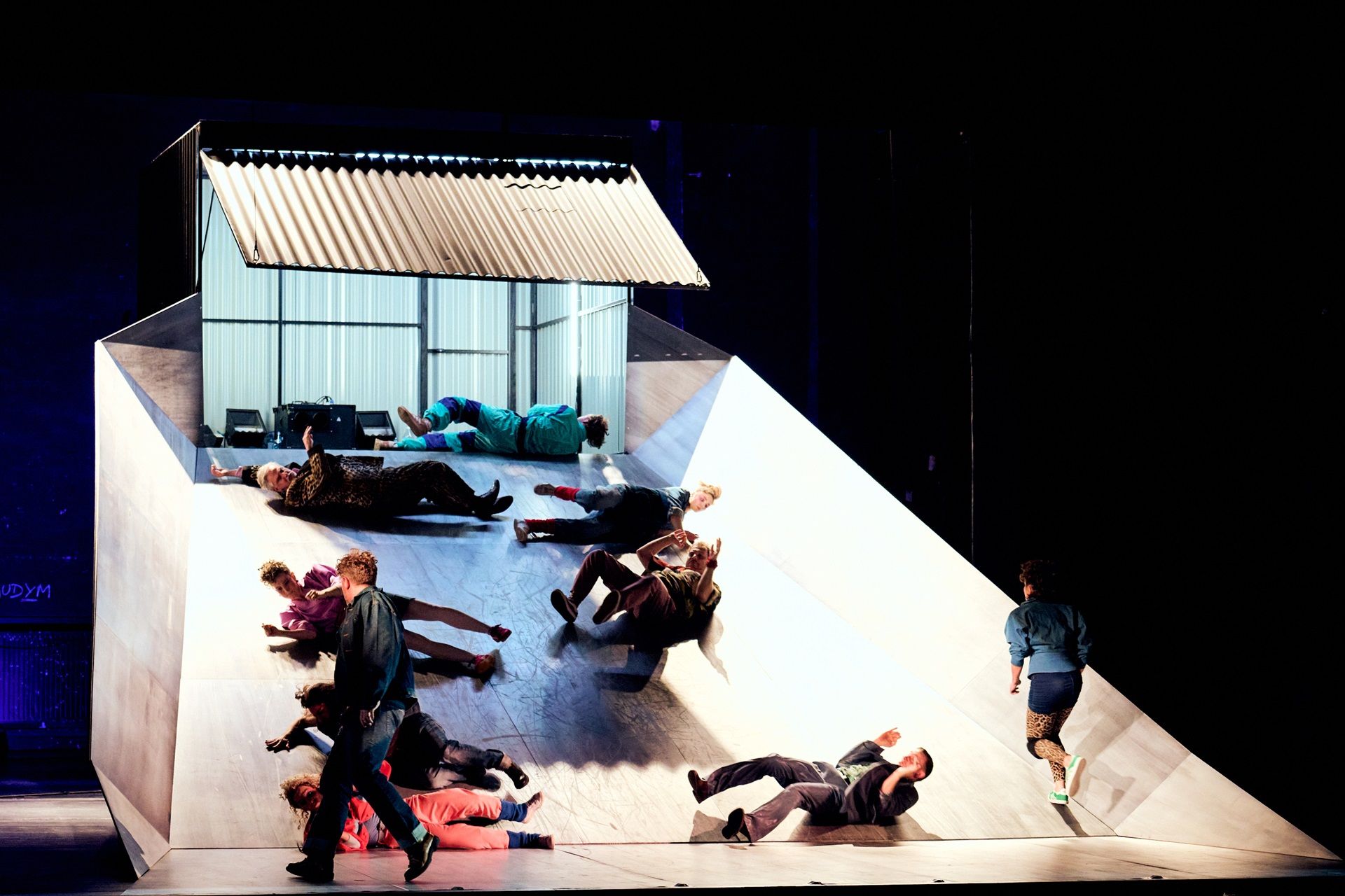 Bohaterowie "Ludzi bezdomnych" to osoby wciąż aspirujące. Jednym idzie to łatwiej, innym trudniej. Ciekawym zabiegiem okazała się rampa, po której to wspinają się (z obowiązkowym potknięciem), by za chwilę znów się stoczyć (za scenografię i kostiumy odpowiada Magdalena Gut ). Zjawiskowo wyglądały też grupowe zjazdy z tej konstrukcji, jednak to trochę za mało pomysłów na ponad półtoragodzinną, wielowątkową opowieść. Niewiele wniosła też do spektaklu muzyka, która po prostu.. była (jej autorka to Aleksandra Rzepk), jednak nie wywoływała już większych emocji, podobnie zresztą, jak choreografia Anny Marii Krysiak. Zupełnie nie przemówił też do mnie fragment wyświetlony w formie projekcji w ostatniej części spektaklu (generalnie im dalej, tym gorzej i mniej ciekawie; miałem wręcz wrażenie jakiegoś pośpiechu w wykończeniu opowieści), w dodatku jak zwykle mogliśmy oglądać usta nie zgrywające się czasowo z wypowiadanymi słowami, co konsekwentnie będę piętnował (ale i pochwalić muszę brak mikroportów poza tą jedną, wspomnianą sceną).
