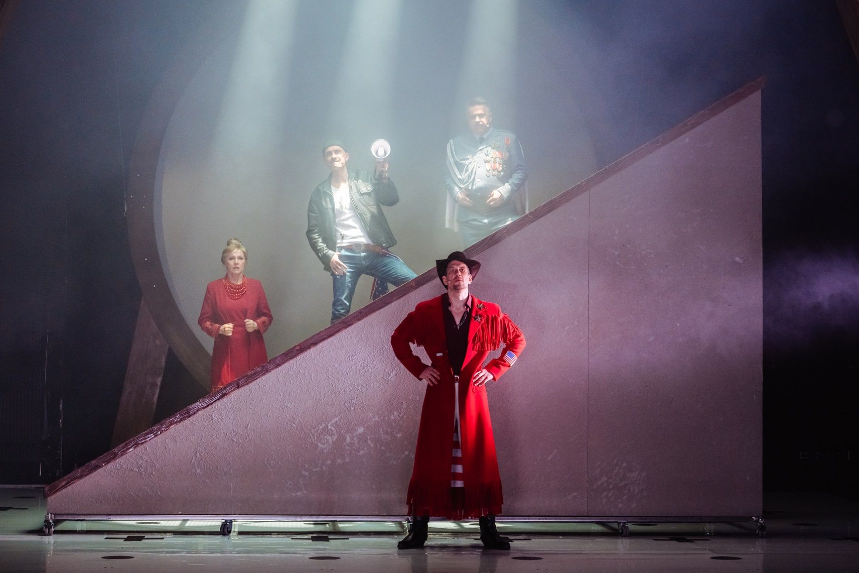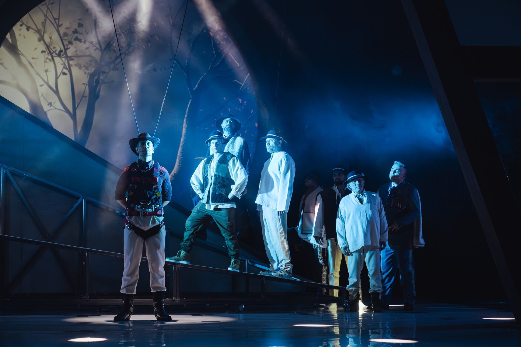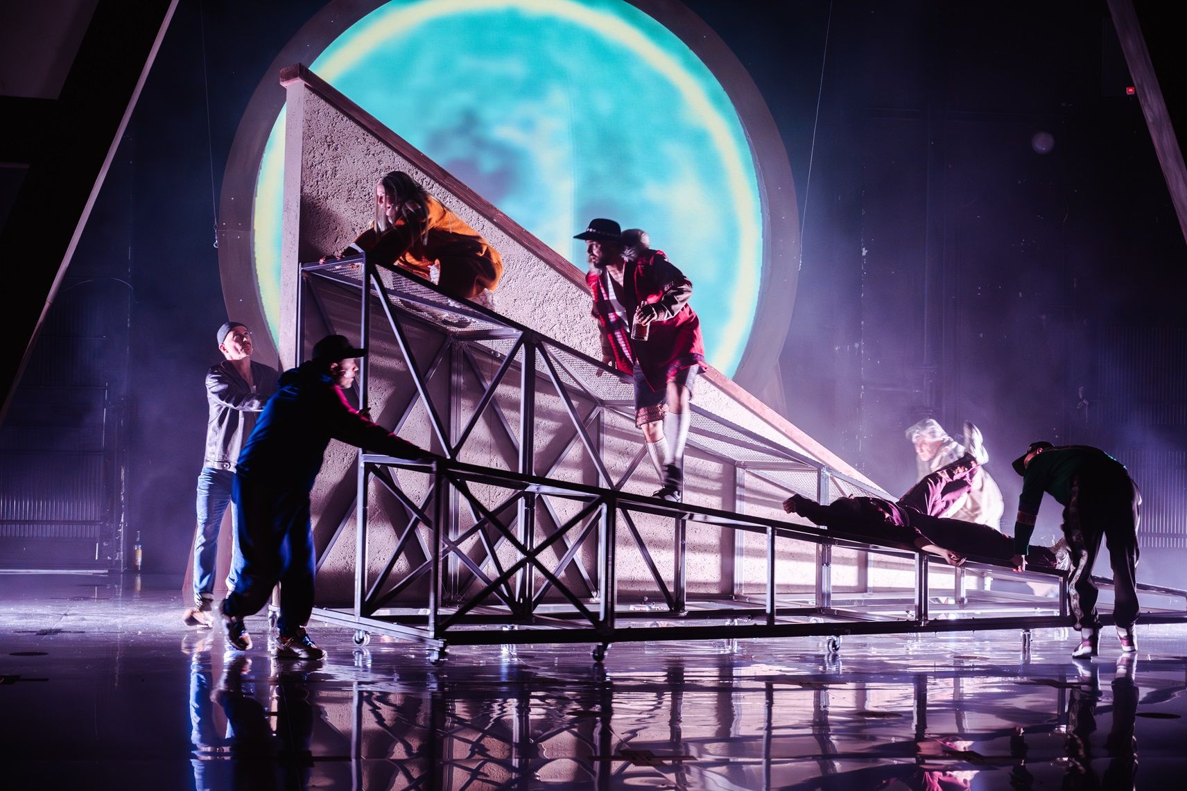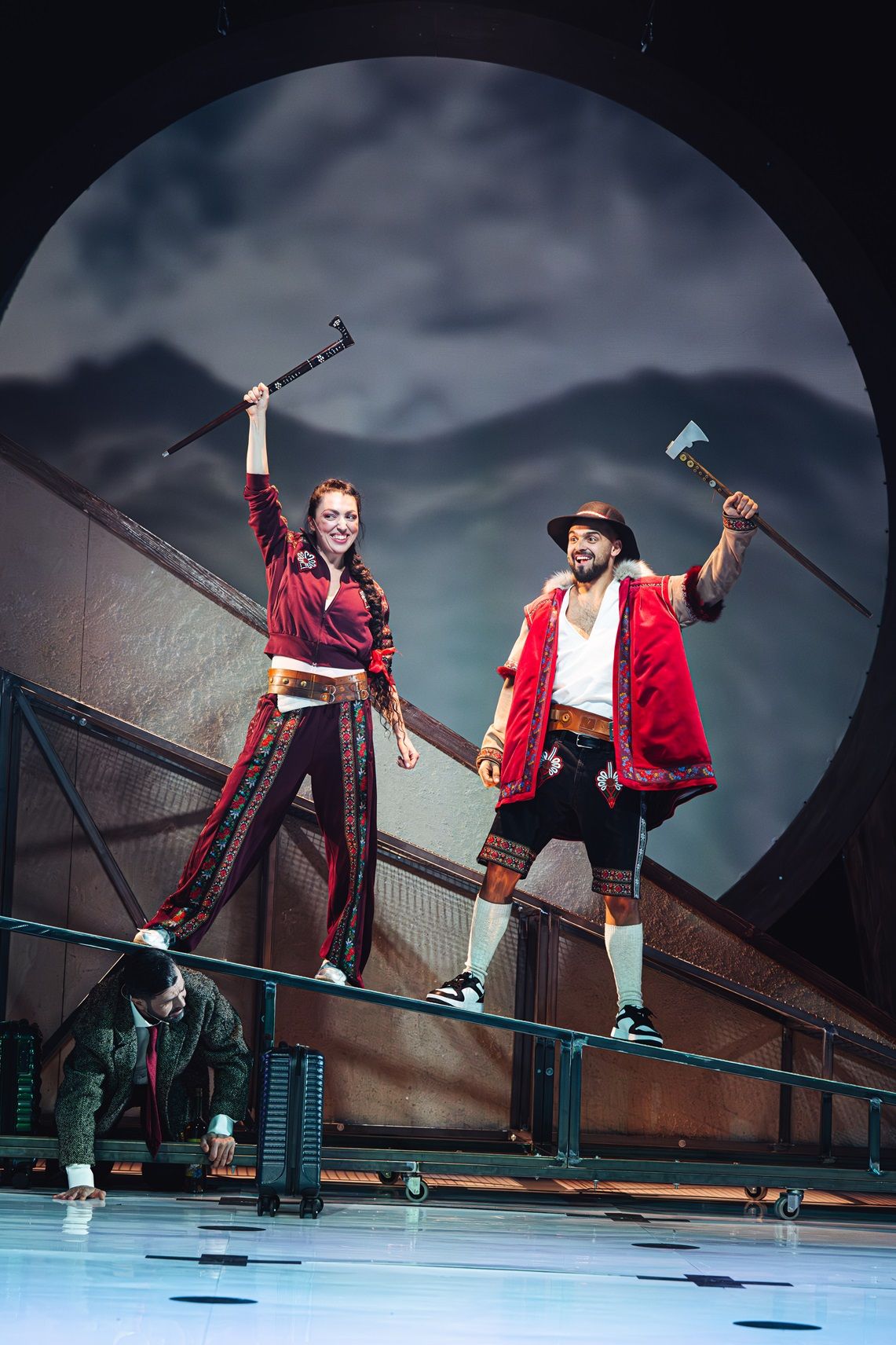 Wydaje mi się, że w tym spektaklu jest wszystko, co się z górami kojarzy, ale i znacznie więcej. W różnych proporcjach mamy tu więc m.in. sprzedajnych urzędników samorządowych, plan filmowy, inwazję zombie, Karola Marksa i prawdziwy komunizm (oraz sporo zmyślonych wyobrażeń o nim), bananowe dzieci z pokolenia Z, antydepresanty, biały miś, Jana Pawła II, ks. Tischnera, Jakuba Szelę, Witkacego, nieudolną policję, taksę klimatyczną, ciupagi, bilbordozę, alkohol, goralenvolk i polityków prawicy uciekających na Węgry. Tylko koni i owiec żal, bo się biedne bydlątka jakoś nie załapały do tego korowodu. Mamy też muzykę z serialu "Janosik" Passendorfera, skomponowaną przez Jerzego "Dudusia" Matuszkiewicza oraz w finale "Płoną góry, płoną lasy" Czerwonych Gitar (wykonane absolutnie przebojowo - bielski zespół ma wybitne głosy, a ja uwielbiam tę piosenkę). A pomiędzy całe mnóstwo innych dźwięków (autorem muzyki jest Marcin Nagnajewicz, choreografię stworzył Aleksander Kopański). Do tego uzupełniona projekcjami prosta, obrotowa i wielofunkcyjna platforma, na którą bohaterowie wspinają się niczym na szczyt (scenografia i multimedia - Marcin Chlanda) oraz parzenice na krótkich spodenkach i amerykańską flagę w podszewce płaszcza (kostiumy - Adrian Lewandowski). No i haki - takie na jakich powieszono zbójnika, ale w zwielokrotnionej ilości niczym w rzeźni.