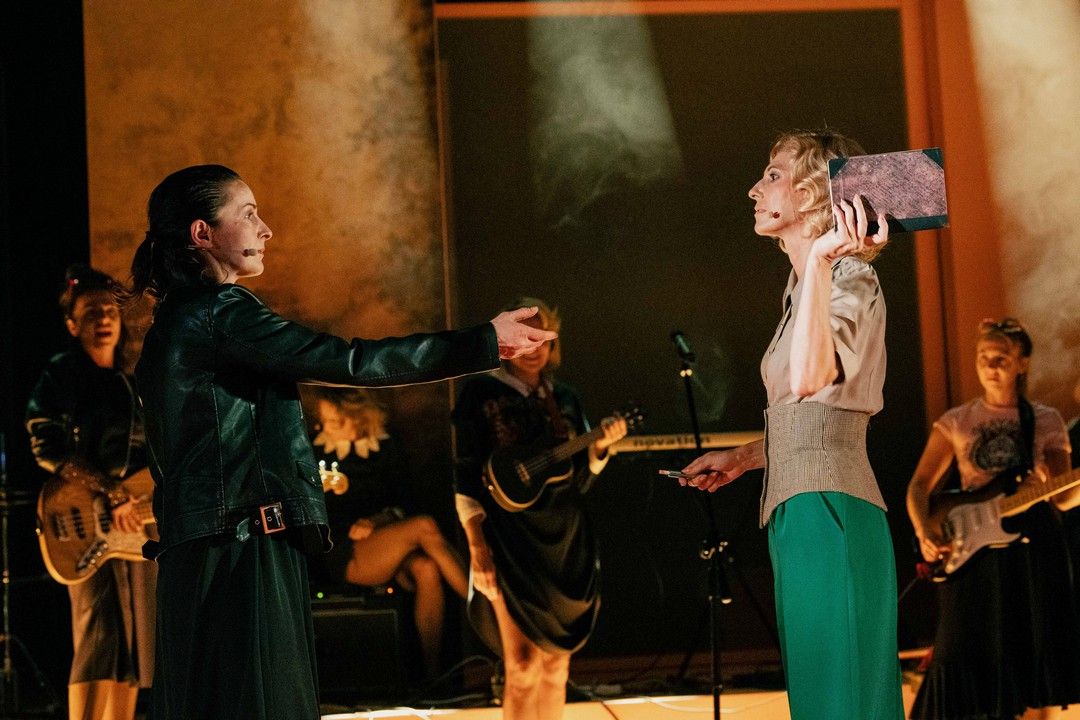 Dwa spektaklowe akty wykorzystują inną formę - w pierwszym to po porostu opowiadanie historii (mocno odcisnęła się we mnie scena wyboru swoich pracownic, wyglądająca niczym antyczny targ niewolników), w drugim kobiety mają szansę powiedzieć nie tylko o tym, co je spotkało, ale jak się z tym czuły i czują, wplatając swe losy w piosenki. Nie ukrywam, że dysonowała mi nieco formuła współczesnego, rockowego zespołu, ale była ta metafora dość trafna i czytelna, a przede wszystkim nie zacierała znaczenia historii i sensu słów (a w niektórych piosenkach, jak kultowym "Seksapil" wprowadzała znakomite dodatkowe piętro znaczeniowe). Panie z bielskiej obsady śpiewają znakomicie, przyczepić mogę się więc jedynie do pewnej niespójności, którą wprowadziło to rozwiązanie. Tradycyjnie już w przypadku wykorzystania multimediów (świetny wątek poprzedniej służącej, która zginęła i pojawia się w wizjach swojej następczyni) będę czepiał się też niezgrywania się ruchu warg wyświetlanych na ekranie z głosem postaci. Myślę też, że spektaklowi dobrze zrobiłby lekki skrót. Ale generalnie idąc na "Służące do wszystkiego" dostaniemy dobrą i stosownie opowiedzianą lekcję z naszej historii, którą warto zapamiętać i odrobić. bez teatralnych fajerwerków, z dużym zaufaniem do tekstu i jego siły, co jest wielką zaletą.