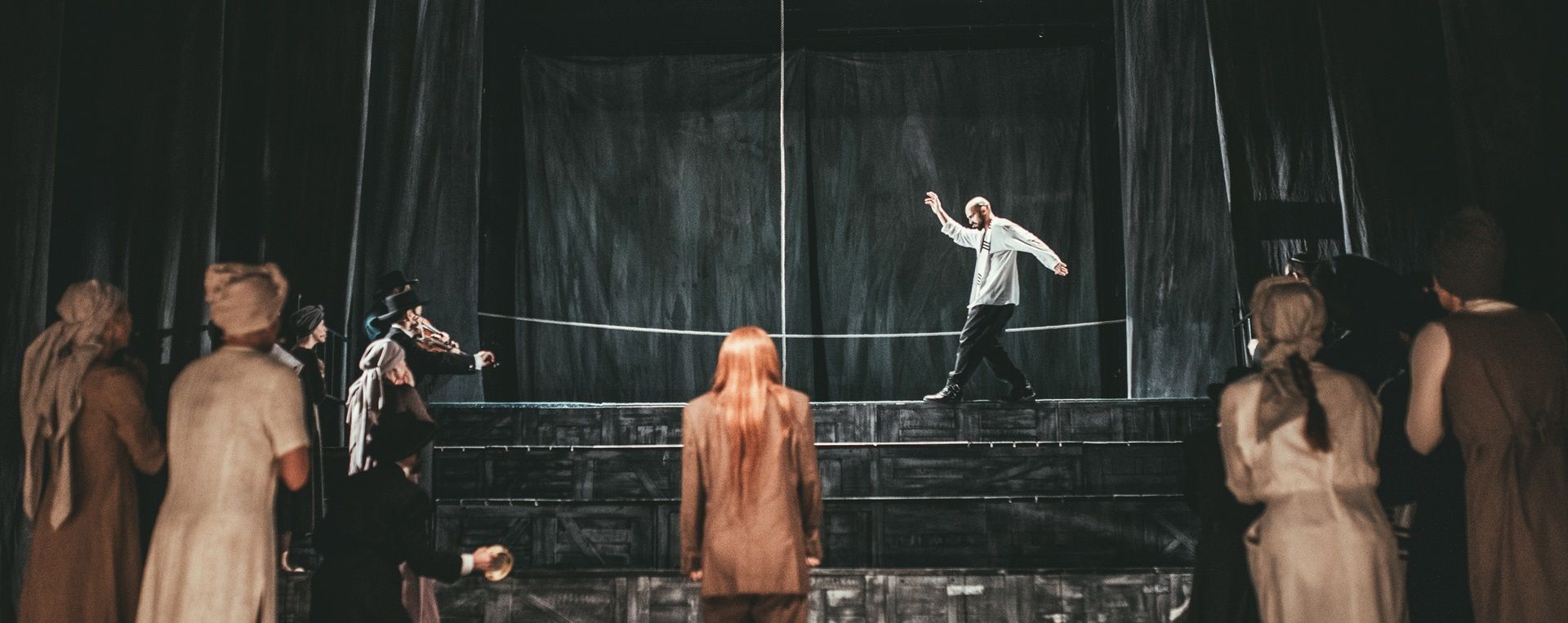 Mateusz Wojtasinski to w tym spektaklu człowiek-instytucja. Zjawiskowo śpiewa, dialoguje, wspina się, czyni akrobacje, tańczy, robi sztuczki magiczne. Jego Jasza to postać pełna życia i buntu, trochę komediant, trochę utracjusz, trochę niebieski ptak brnący ciągle po rozwieszonej linie. Rozwieszonej nad przepaścią dosłowną, ale i metaforyczną - przepaścią obyczajową, przepaścią religii i moralności. Marzy mu się jednak wspinaczka po innej linie - tej zwisającej z góry, jak wyzwanie rzucone Bogu. Jest wiarygodny, kiedy stawia fundamentalne pytania o istnienie Tego, który wciąż jest większym od niego sztukmistrzem. Pytania o tożsamość i działanie Boga nie uzyskują w spektaklu łatwych odpowiedzi - zmuszają jednak do refleksji tak katolików, jak ateistów, a i zapewne zmusiłyby Żydów. Żydów, których w Polsce w zasadzie nie ma, nie ma ich tradycji i obrzędów. I tu dygresja - Uderzył mnie ten spektakl w kontekście wojny na Ukrainie - wojny niosącej śmierć, zagładę i zniszczenie, wojny niszczącej też kulturę i tradycję. Jak dziś wyglądałaby Polska bez II wojny światowej? Czy pomijając wszelkie inne aspekty naszej tragicznej historii dzielnice żydowskie wyglądałyby tak, jak w chyba jedynej dobrej scenie finałowej niezwykle słabego filmu "Ambassada" Juliusza Machulskiego?