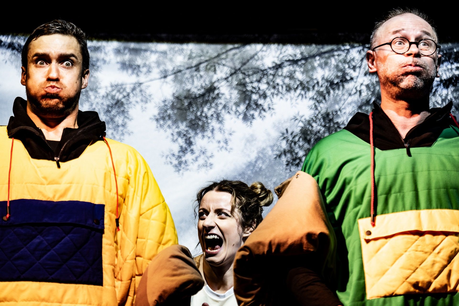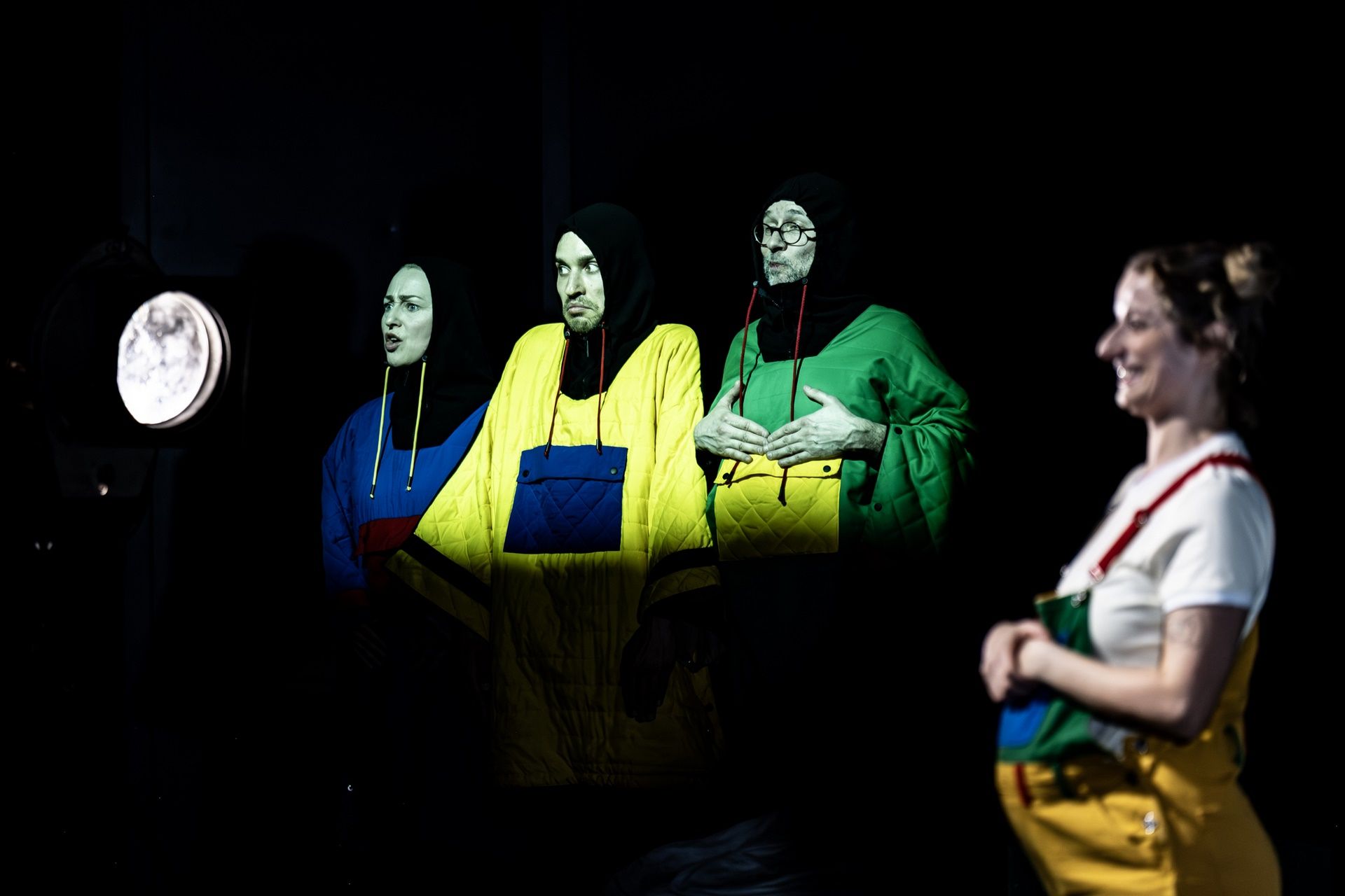 Oddzielne pochwały należą się aktorom na czele z główną bohaterką, graną przez Linę Wosik. Siła emocji tej roli i sposób, w jaki w nią weszła, to naprawdę najwyższy rodzaj aktorskiego ekshibicjonizmu w pozytywnym znaczeniu tego słowa. Im dalej, tym jej wyczerpanie jest większe, emocje silniejsze, ale siła jej bezgłośnego krzyku pod koniec to chyba jedna z najbardziej dojmujących teatralnych cisz. Niesamowite, jak z zarażającej optymizmem i śpiewającej "Kukułeczkę" prowadzącej, potrafi przejść drogę na dno emocjonalnej otchłani. Pozostali aktorzy występują przede wszystkim w ptasich rolach (z niewielkimi ludzkimi momentami) - Krzysztof Boczkowski jako papuga amanda górska, Anna Błaut jako mewa siwa (oboje też znakomici jako rodzice w retrospektywie z dzieciństwa) i Dominik Smaruj jako pingwin cesarski. To właśnie ten ostatni niewątpliwie skradł moje serce swoją śmieszną powagą, lekkim nadąsaniem i wzruszającymi historiami z opisem lęgów bohatera. Niesamowita mimika i te wszystkie zwierzęce i nie tylko onomatopeje - naprawdę jest się czym zachwycać! Wspomniana ptasia trójka jest na scenie od początku i niemal cały czas, ale w spektaklu pojawia się jeszcze jeden ptak, o zupełnie innym charakterze - ślepowron zwyczajny, który staje się w kreacji Eweliny Paszke-Lowitzsch zwiastunem klęski, świadomym jednak niepotrzebnej i niesprawiedliwej demonizacji. Takie ptasie memento…